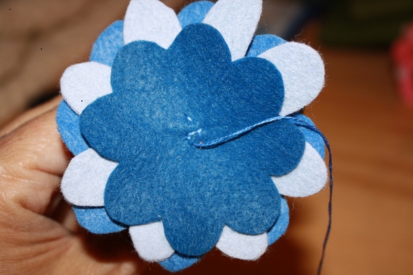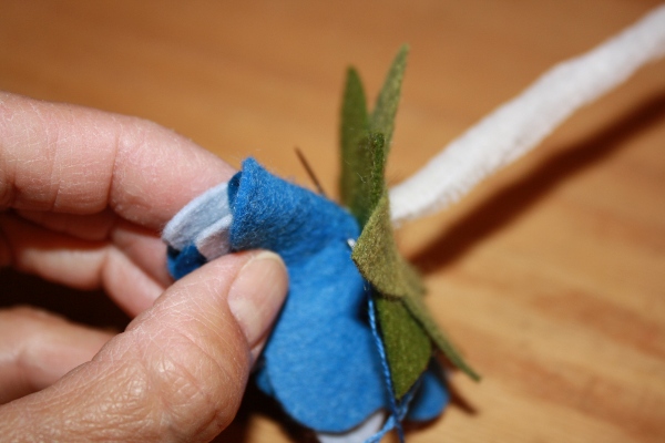 14] In several areas around the flower you will be “pinching” all 3 petal layers of fabric (don’t grab the leaves yet) and tacking them together. Use a color of embroider floss that matches petal 1. How “deep” you pinch the flower and how many pinches you make will affect how cupped your flower becomes. This is all a matter of taste. Tie off.