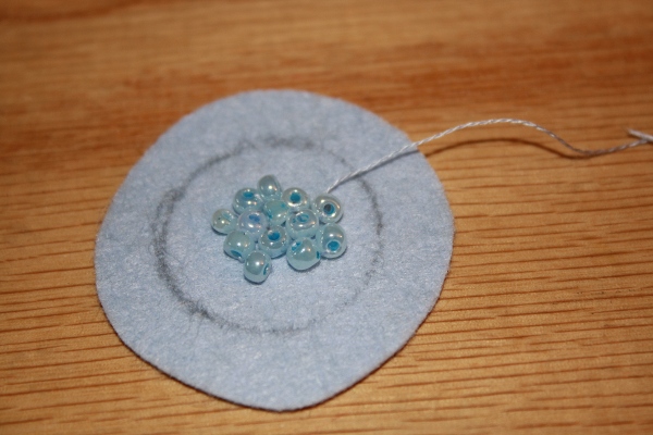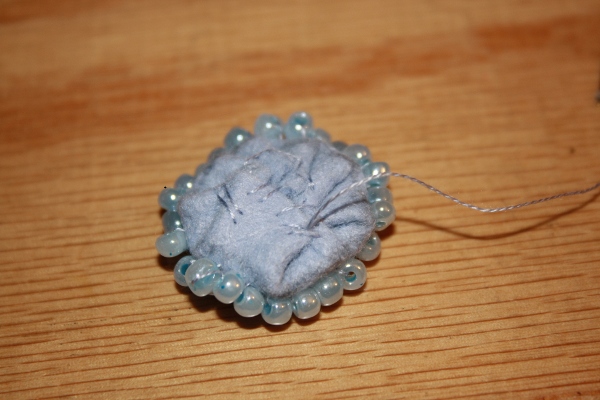 8] Turn under the seam allowance, and tack to the backside of the beaded circle. Set aside.