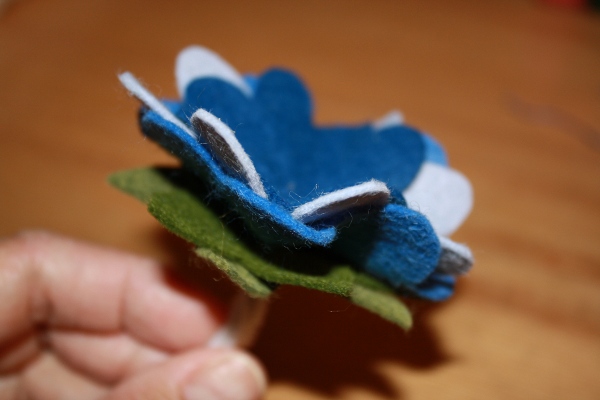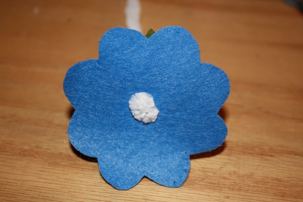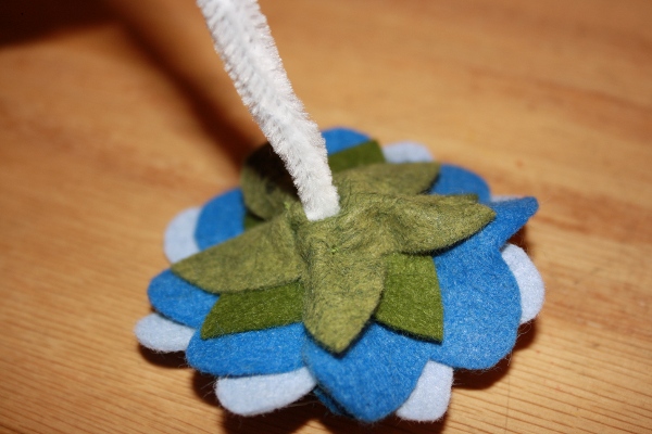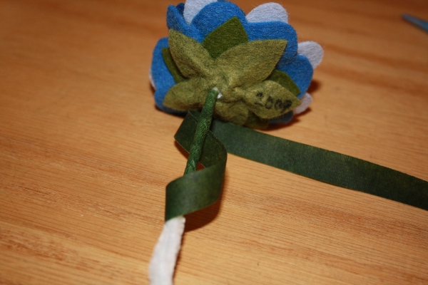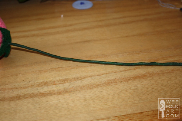 Options: If you would like to add leaves to the stem, cut a few out of felt, and using more florist tape, add them to the stem. Because I plan to have many flowers in this Memory Bouquet, I do not want leaves on the stems.