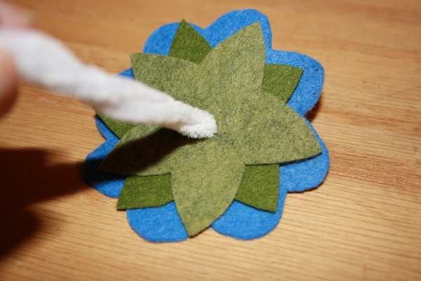 9] Place the 2 leaves on top of petal 1 lining up centers. Using a “sharp poky” (I used a size 8 knitting needle) poke a hole through all three layers. (The hole should be big enough to allow 3 pipe cleaners to go through but still fit snug snug.)