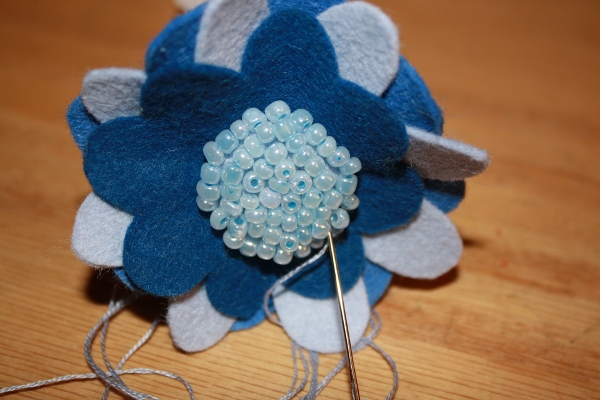 16] Using a matching thread, tack the beaded center to the center of the flower. You should only need to go through the center and petal 3 to secure.