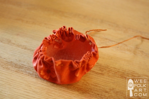 4] Begin gathering the running stitch until you create a pouch.