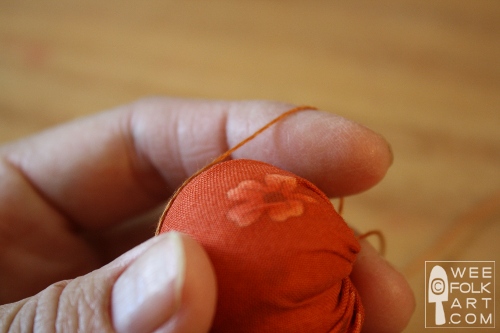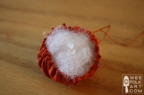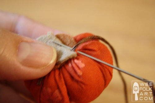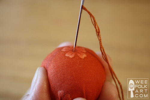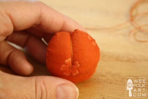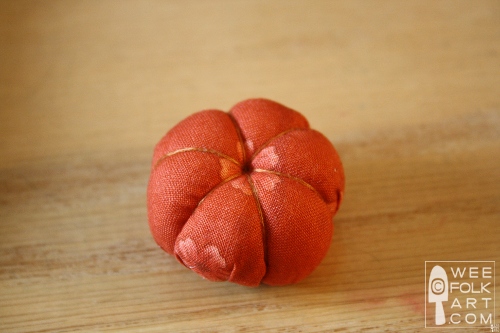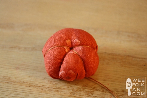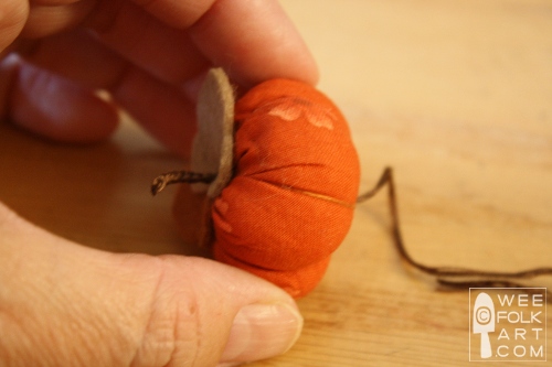 5] Fill with stuffing and finish gathering the running stitch and tie off. The needle will be secured at the center top of the pumpkin.