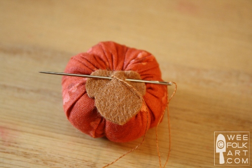 11] Thread the 6 strands of floss into a needle, position the stem where you want it on top of the pumpkin, and poke the needle through the pumpkin and out through the center bottom. Make a small stitch and poke the needle back up to the top, pulling it out under one of the leaves. Tie off the thread.