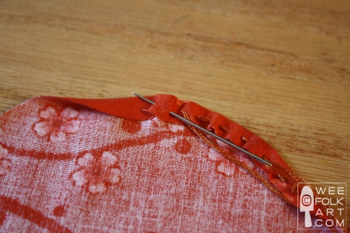 3] Turn under 1/4″ hem to the wrong side of the fabric. Sew a running stitch around circle using 3 strands of floss. Do not cut thread.
