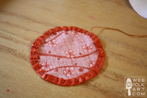 3] Sew a running stitch around edge of circle. Do not cut thread.