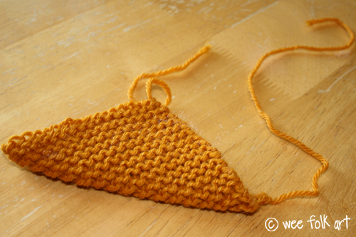 Fold your birdie in half diagonally to make a triangle. Have your corner with the smaller tail (probably the cast on tail) meet at the right angle and the longer tail (left from binding off) be on one of the acute ends. You remember your geometry, right? 😉 The acute ends will be along the fold.