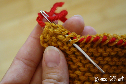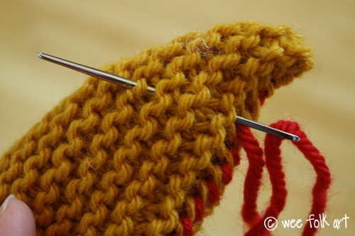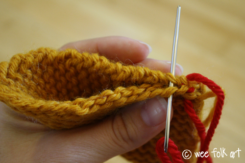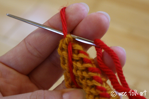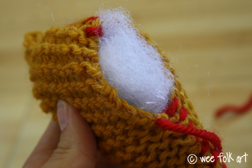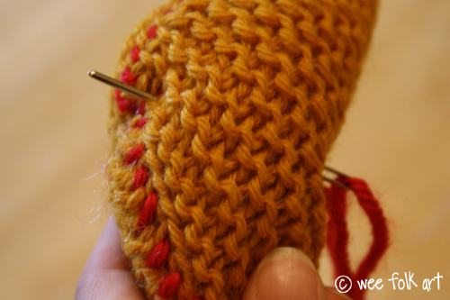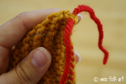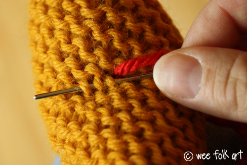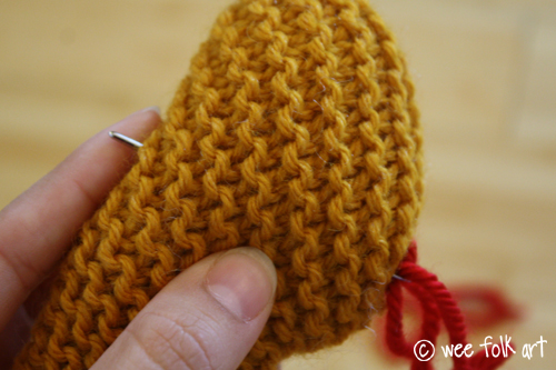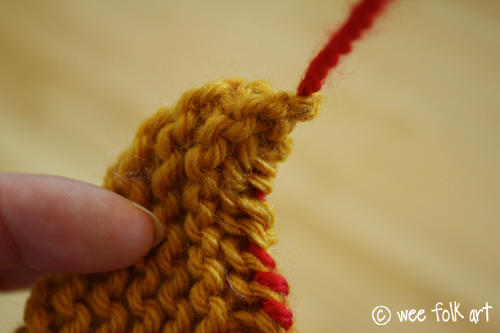Use a slip stitch to catch the edge of a loop on either side to sew up the first seam. You will be working from the right angle to the acute angle that does not have the other yarn tail attached. Note: I’m using red yarn just so you can see what I’m doing. Your yarn tail will obviously be the same color as the rest of your bird and you will not be able to see it when you are done.