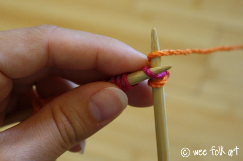 Slide the old stitch OFF the left needle (the pink loop). Be careful not to drop the stitch on your right needle (the orange loop). You now have new stitch on the right needle. Gently tighten the new stitch by pulling down on the live yarn.