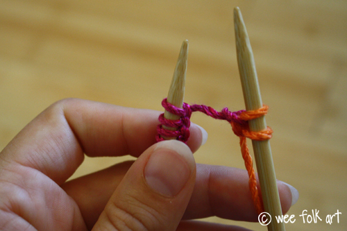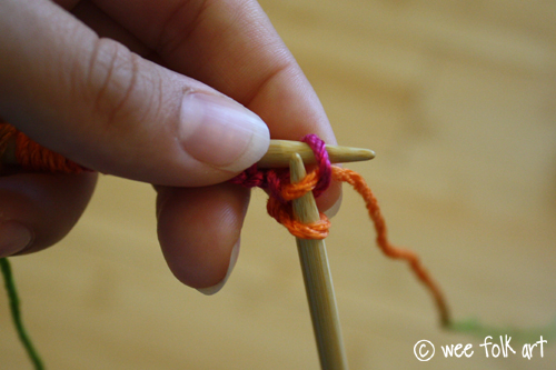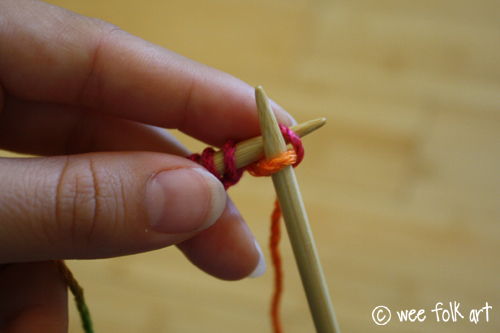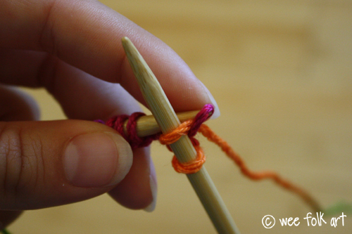 Hold the needles together in this cross shape with your left hand and use your right hand to wrap the live yarn AROUND the right needle. Be sure to bring the yarn AROUND from the back (counter-clockwise). This loop will be your new stitch (the orange bit of yarn).