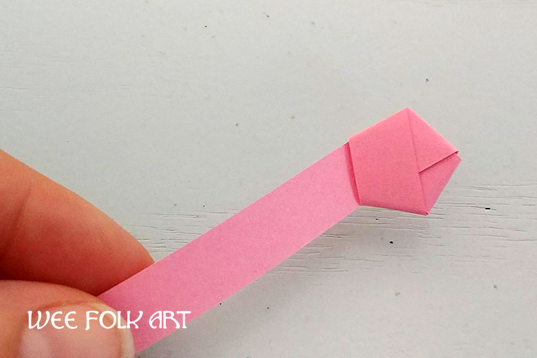 Carefully slide the knot down towards the end of the origami paper strip. You want a tail that is only about 2x the width of your paper strip. Flatten the knot into a neat pentagon base shape.