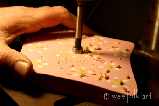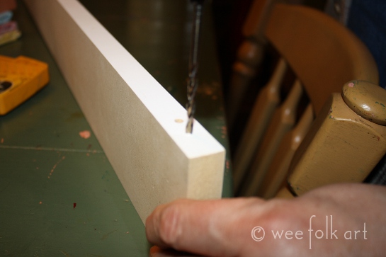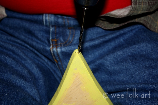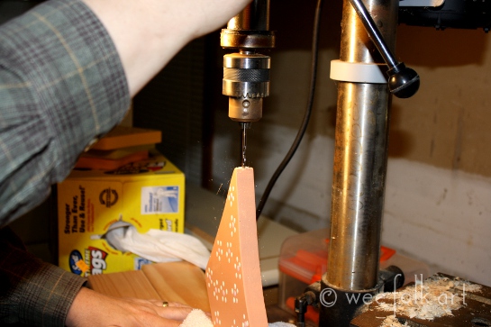 If you are adding a peg to your kite, mark the center, and drill a hole that is a smidgen bigger than the part of the peg that goes into the wood. We used a drill press but you can use a hand held drill. You can go all the way through the kite.