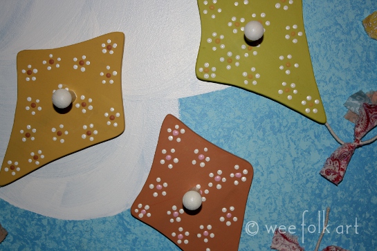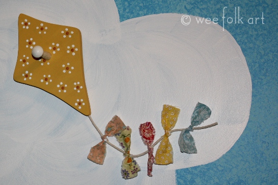 and turned it into a wooden kite with a peg suitable for hanging “stuff” 🙂 Of course, if you just want to use them for decoration, simply leave the peg off, and let a sky full of kites grace your child’s room. (BTW… if you’d like to see how we painted the wall behind the kites, check out the post found HERE.)