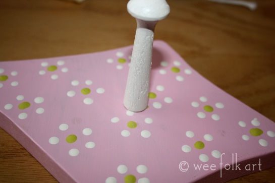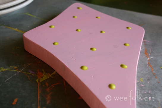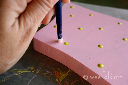 Dip the end of a thick round paintbrush in paint, and randomly make the dots for the flower centers on the kite top. Redip with each dot.