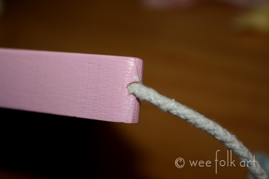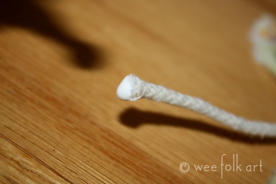 Add a dab of glue to the hole and insert the taped end of the rope into the hole.