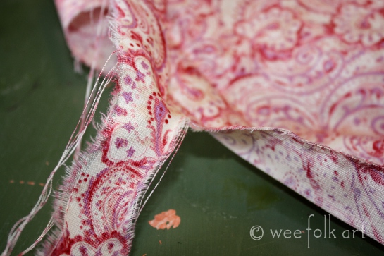 For the ties, rip and tear strips of fabric 1 1/4″ wide. (For tips on how to rip and tear, see the post HERE.)