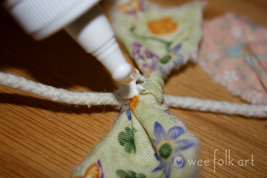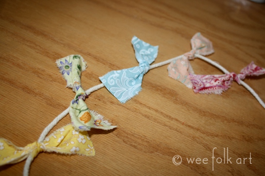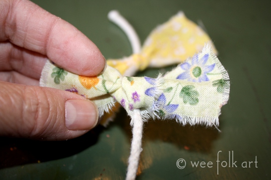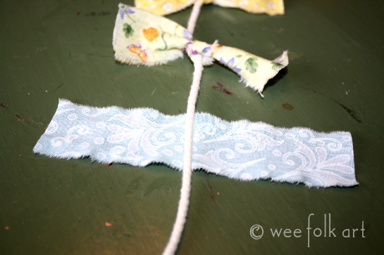 Cut each piece 5″ – 6″ long. Tie them to the rope every 1 1/2″. Try to tie them so the right side is showing. I put 5 ties on each rope.