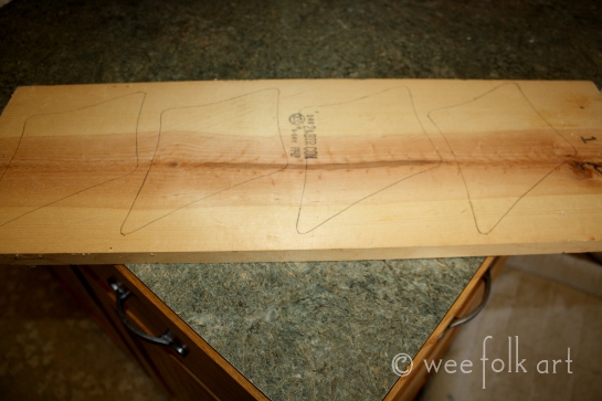 Enlarge Kite Applique Pattern 200% and make a copy. Using packing tape around edges of the kite pattern, cut out the kite. This will be your template used for tracing the kite on the wood.