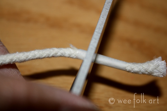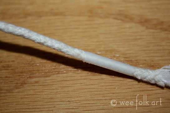 For the tail, cut your rope about 13″ long. On one end, wrap a piece of tape tightly around the end, then cut off so about 1/4″ of tape is on the end. This will make it easier to push into the hole.