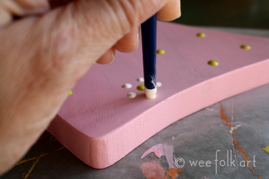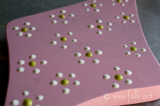 To make petals around the centers, using the same paintbrush, make 5 dots (petals) around each center. Allow to dry completely.