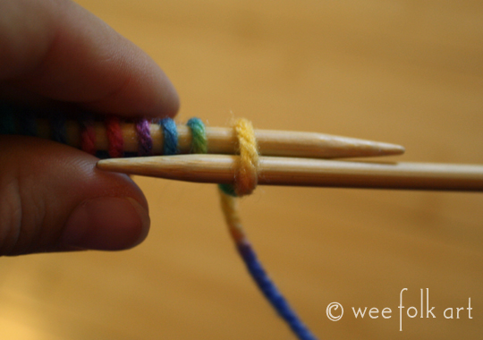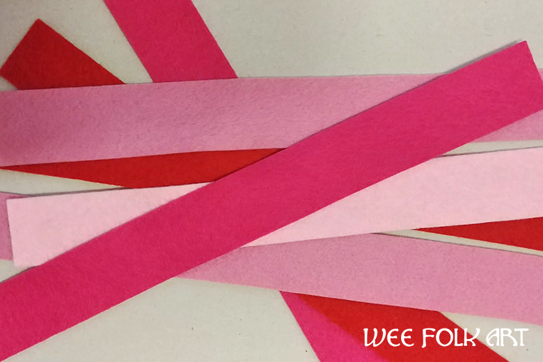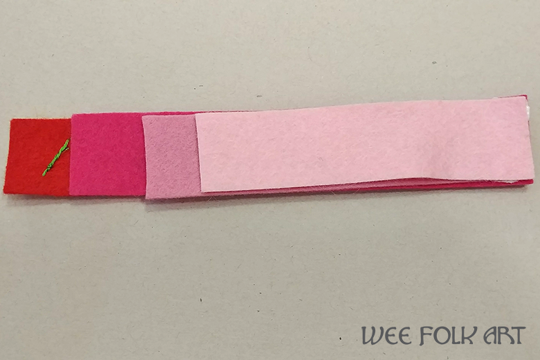 Use a rotary cutter to cut your felt into 1 inch wide strips. For my ornaments I used darker colors on the outside and used progressive lighter colors working towards the middle of the felt ornament. You will need two matching felt strips that are 6.25 inches long, two matching felt strips that are 5.5 inches long, two matching felt strips that are 4.75 inches long, and one final felt strip that is 4.25 inches long.