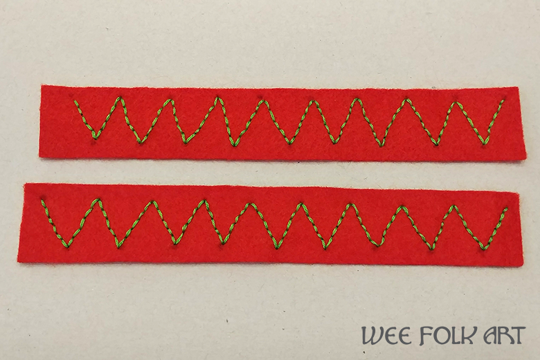 If you would like to add embellishments, embroider a design on the longest set of strips. I added a basic zig-zag pattern in a contrasting thread. To do this mark dots along one side of the strip about 3/4 of an inch apart. Mark dots along the opposite side of the strip in the middle of the first set of dots.