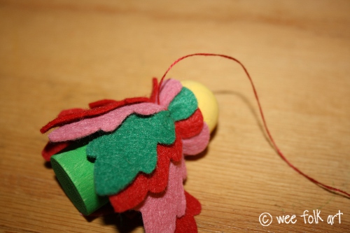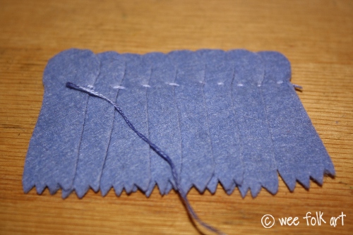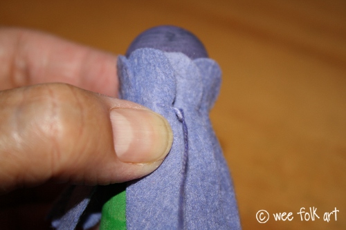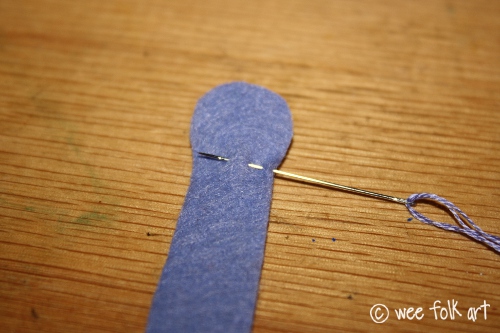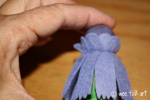 To join the petals to the wooden peg, wrap your petals around the neck of the peg, overlapping the 1st petal over the 8th. Sew a couple more running stitches connecting the petals.