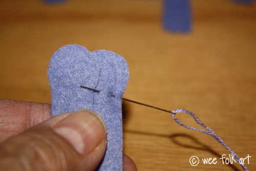 Using quilting thread or 2 strands of matching floss, starting at the edge of the first petal, sew a running stitch to the middle of the neck.
