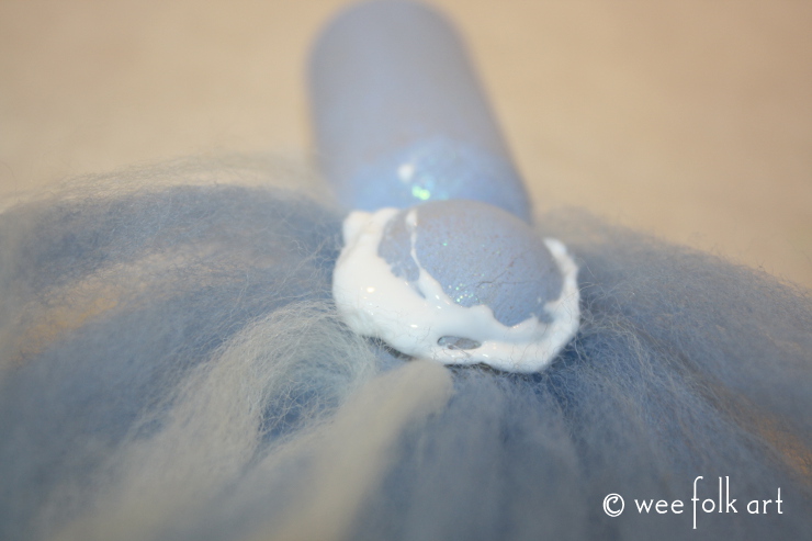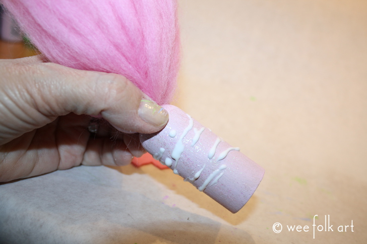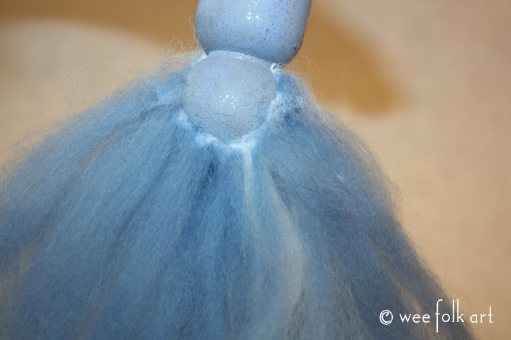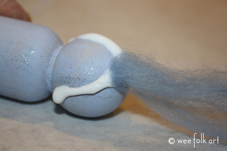 Carefully turn the doll over, making sure not to disturb the roving you just glued to the doll. Add another line of glue to the back of the head and add more of the roving pieces that have been folded in half.