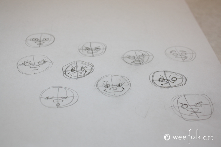 Most people tend to place the eyes too high on the face. Draw your eyes directly on the horizontal line. It may seem like this is too low, but it will give you perfect placement every time. Add a nose and mouth. Although you are going for symmetry, remember this… human faces are not completely symmetric, so your dolls’ face can be off a bit, too!