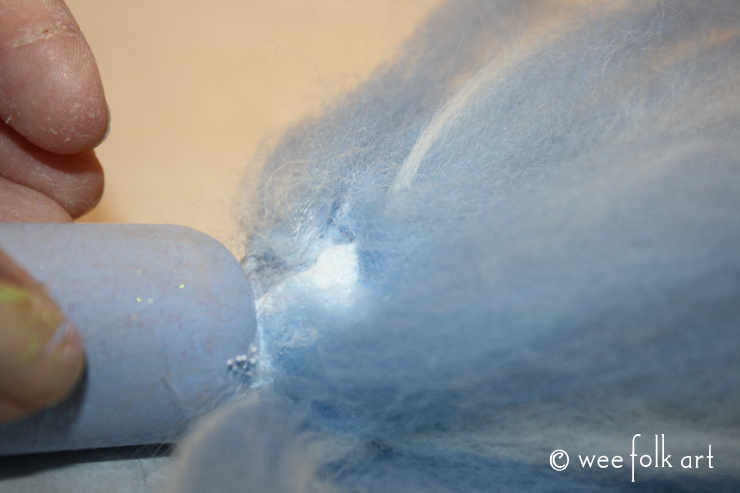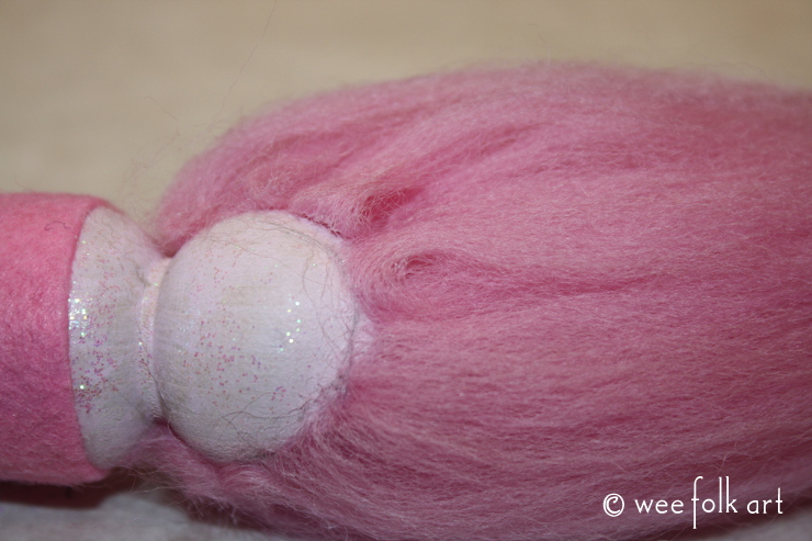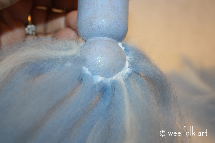 Continue adding glue and roving until the entire back of the head is covered. Make sure when you are adding the final row of roving at the base of the head that the fold is on the glue line. Again, this will give a smooth appearance to the hair. ASIDE… gluey fingers and roving can result in Hobbit Hands 😉 I had to clean my fingers a few times to make sure I didn’t get glue in places it shouldn’t be!
