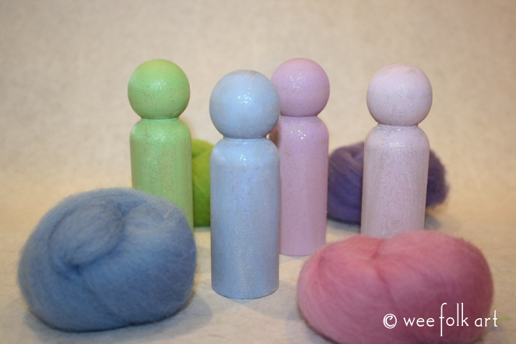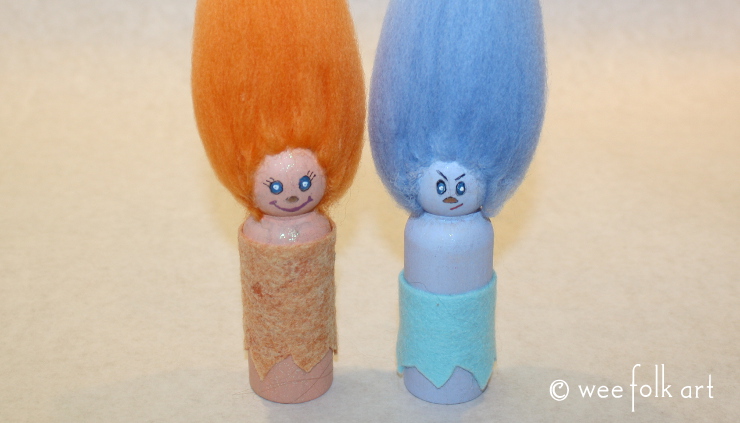 *NOTE: When I made the first peg troll, I didn’t pay attention to how I added the hair and some of the roving strip folds turned sideways. Although this might have been a neat look if I had turned them all sideways, I think they look more like traditional trolls without the “curl”.