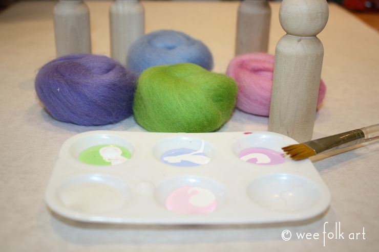Choose your roving colors for the hair. Then mix up some paint a few shades lighter. I started with colors that matched the roving then added white to tone them down. I also added some water to thin the paint. I wanted the paint to be more of a wash than a heavy coat of paint.