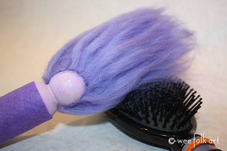 NOTE: Not for children under 3 years old. Also, this is the first time I’ve made these. I don’t know how well the roving will hold up to “hard” play. Although you can rebrush the trolls’ hair, you lose hair with each brushing. This are meant for “gentle” play!