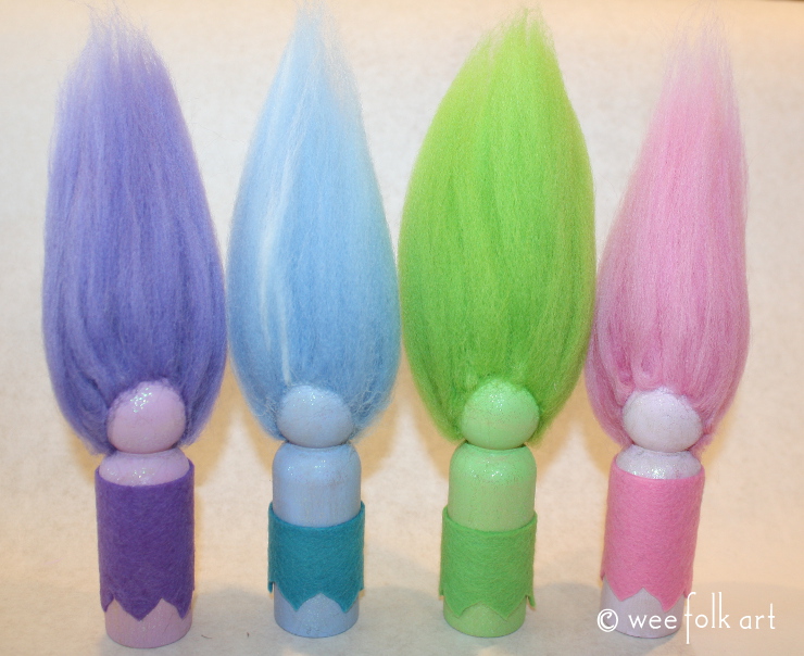 Yesterday Michelle and I were talking about a new project for Wee Folk Art. I had a couple of thoughts when Michelle said, “Hey, how come we’ve never made peg trolls? The colored roving would be perfect.” Well, duh! Why indeed had I never made them? I know my collection of retro trolls often pays a visit to the gnomes in The Thicket, but why not make some peg trolls to join in the merriment? Well, it was a very short conversation before I was off and running! And oh… what fun I had! As a matter of fact I got quite carried away. Big shocker, right? After making 10 peg trolls I thought I had better stop… for now! Well, when Pixie saw them, I knew it was worth the effort. She literally squealed! She fell in love with them, and as always, she preferred the faceless trolls to ones with faces. A Pixie after my own heart!