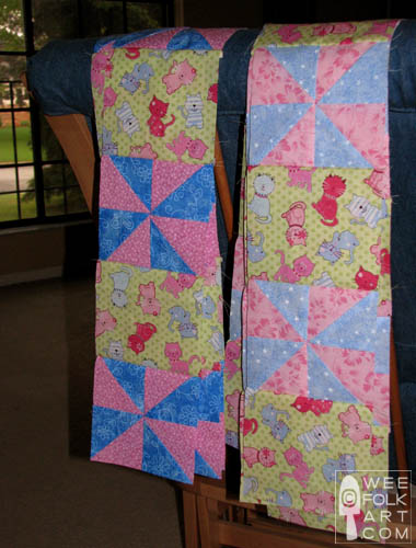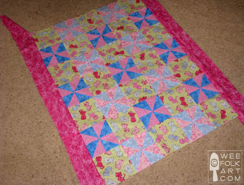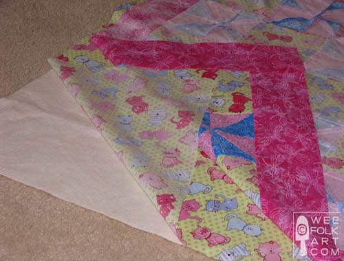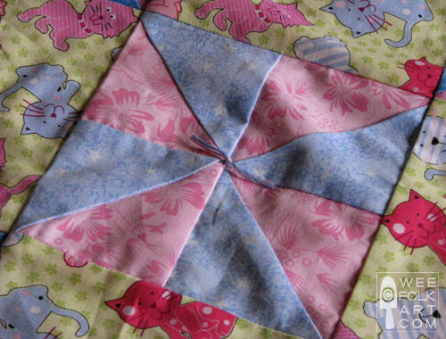 I do the embroidery floss ties (as pictured above) in the middle of each pinwheel and each print square.