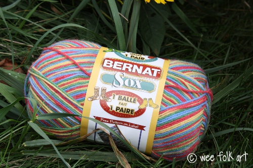Skein of Rainbow Yarn. Bernat Sox Yarn, color Crazy Hot 42706.