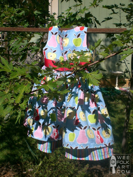Next week is Pixie’s birthday, but we are having a family celebration on Sunday. Her birthday theme is “apples” so it only seemed right that she should be decked out in an apple print. We found some fun fabric at the local craft shop, and I just finished it…way ahead of schedule, I might add! I’m sure Michelle will post a pic of Pixie in the dress at her party, but I adore the dress and couldn’t wait to share it!