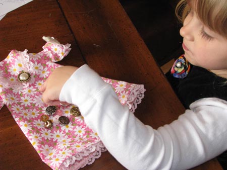 Since my kids are too young to really following a pattern I cut out all the body pieces and trim. I also ironed under all the hems. When it was time to sew I let each kiddo sit on my lap to help use the machine while I made their doll (even the Pixie Girl). They helped guide the fabric and learned a few key saftey rules about working with the sewing machine (sorry the photos are so dark – we are having a lighting issue in the basement… thank goodness for the light built into the sewing machine). Once the bodies were done, the kids picked out their final pieces of trim to attach.