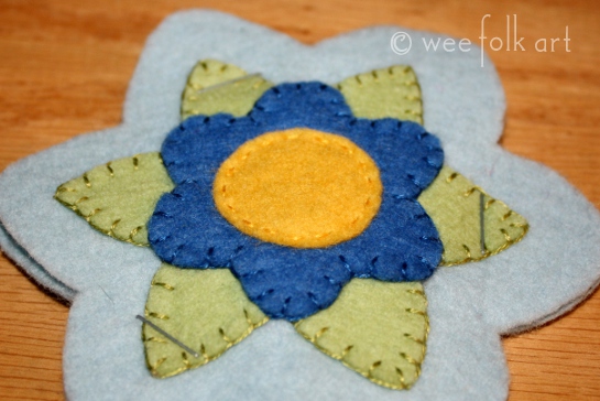 Using a blanket stitch and 3 strands of matching floss, sew small petal over leaves.