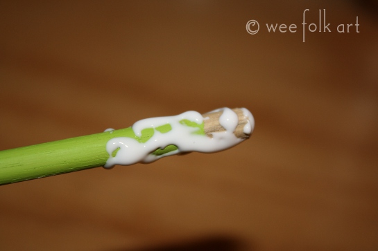 Put crafting glue on the end of the dowel rod that you did not finish. Place glue on 1″ of the rod.