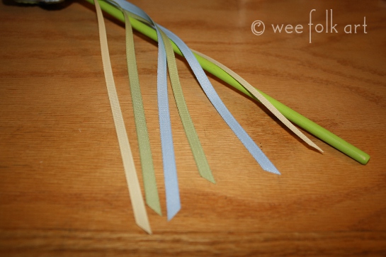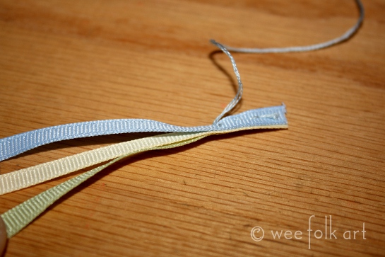 Cut each piece of gross grain ribbon in half so you have 6 pieces 12″ long. Take 3 different colored ribbons and tack them together at one end. Do the same to the remaining 3 ribbons.
