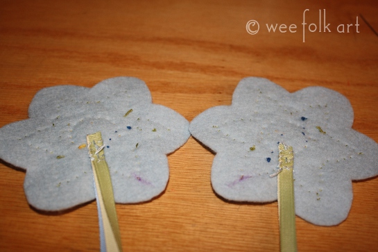 Tack the ribbon clusters to the inside of the 2 flowers on the marks you made earlier. Make sure you do not go all the way through to the front side.