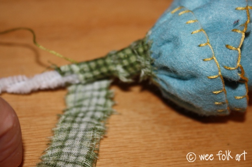 Using a running stitch and 2 strands of matching floss, sew around the stem and leaf, gathering SLIGHTLY.