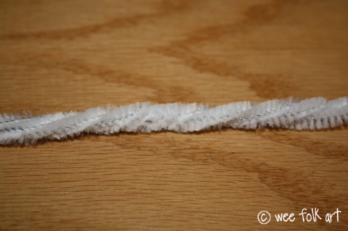 Tack about every 1/2″, going through the pipe cleaner on an angle downward. At the end, leave a 1″ tail that you wrap around the bottom edge and tack in place.