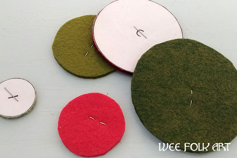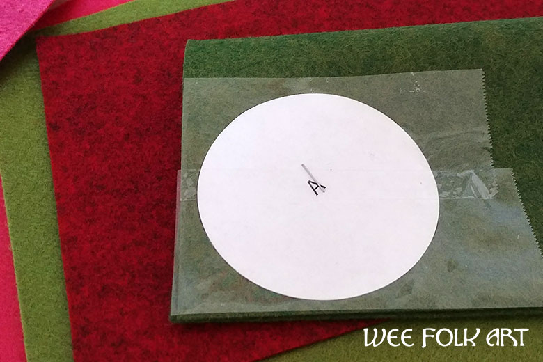 Choose an assortment of Christmas colored wool felt sheets. To cut out the wool felt circles, fold over a piece of felt and staple the pattern circle in place. If you fold it you can cut out both felt circles at the same time. You can use packing tape to help hold the pattern piece in place. (Refer to our HOW to CUT OUT FELT guide for more tips).