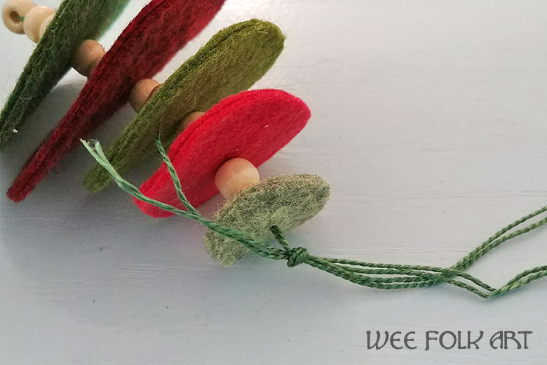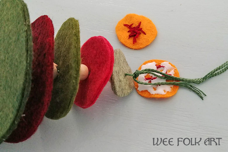 Continue adding felt circles and beads until all the felt disks are in place. Fold over the extra thread and knot it so that you have a hanging loop. Try to make the knot as close to the last felt disk as possible.