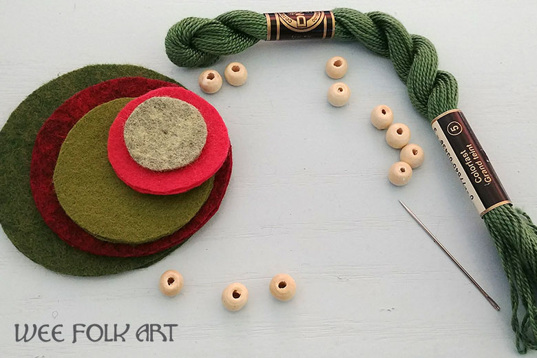 Add two more beads, followed by the next largest felt circle.