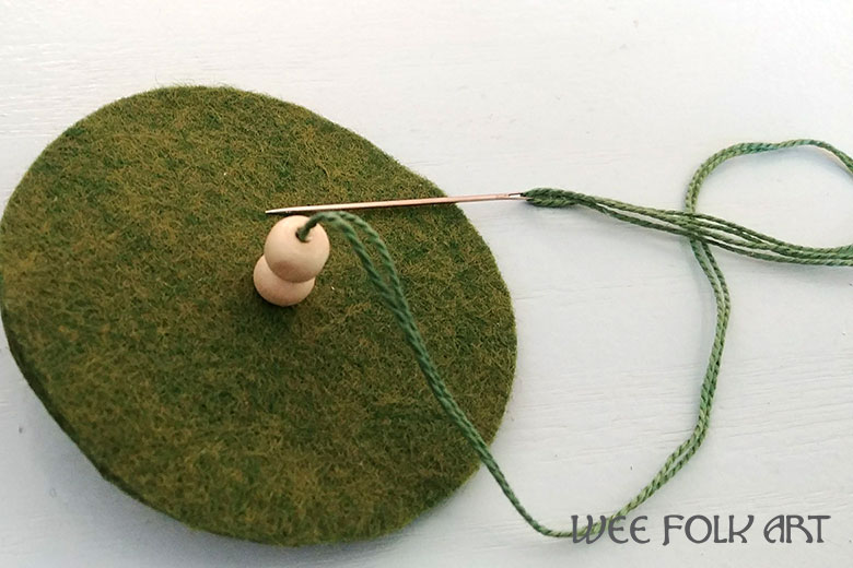 Add two more beads. Then carefully add the largest felt circle by centering the needle in the middle of the felt disk.