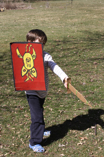 Bug decided that he really wanted to make a Roman Gladiator Shield. I cut out cardboard rectangles for the kids. They then looked at images of roman shields and painted their shields. After the shields…